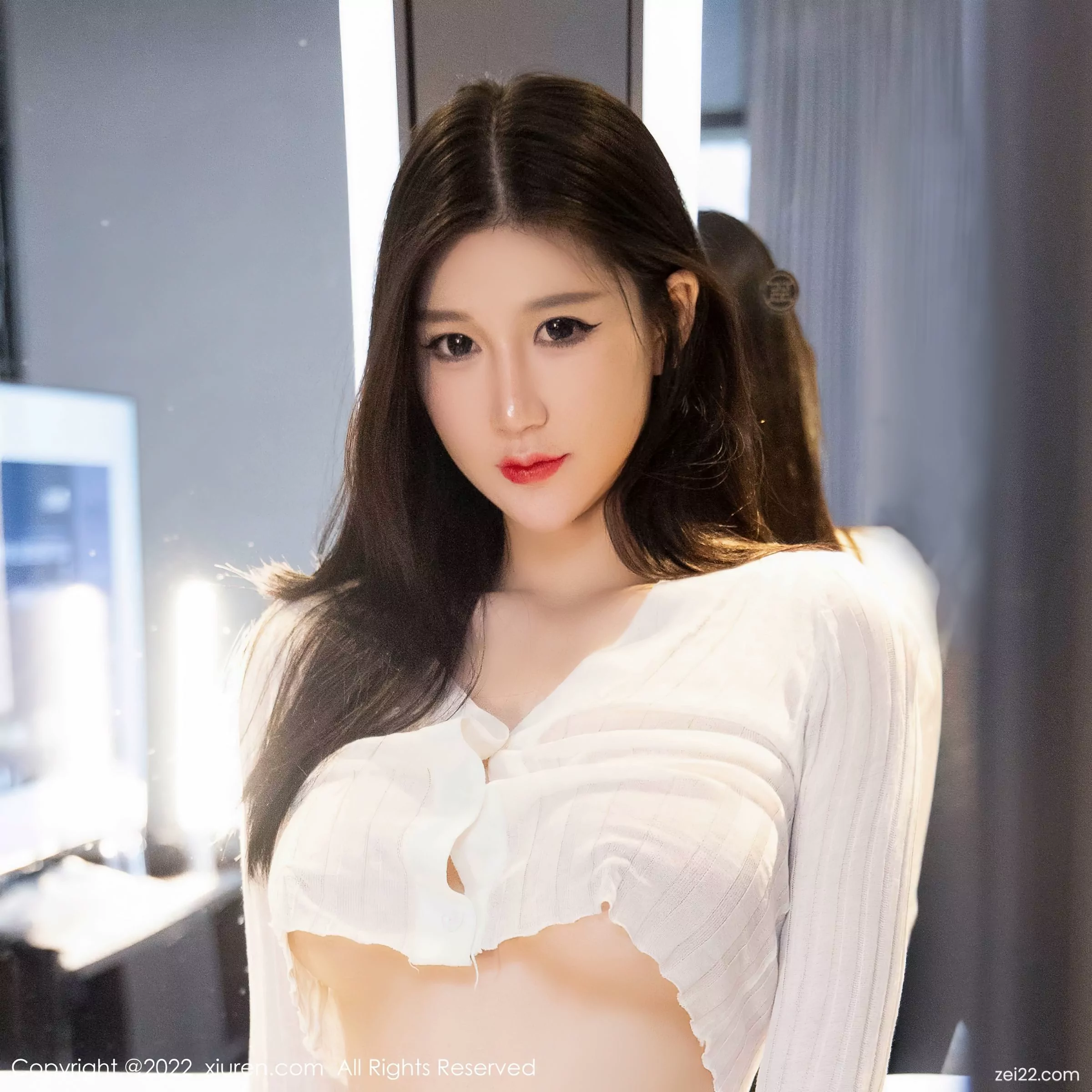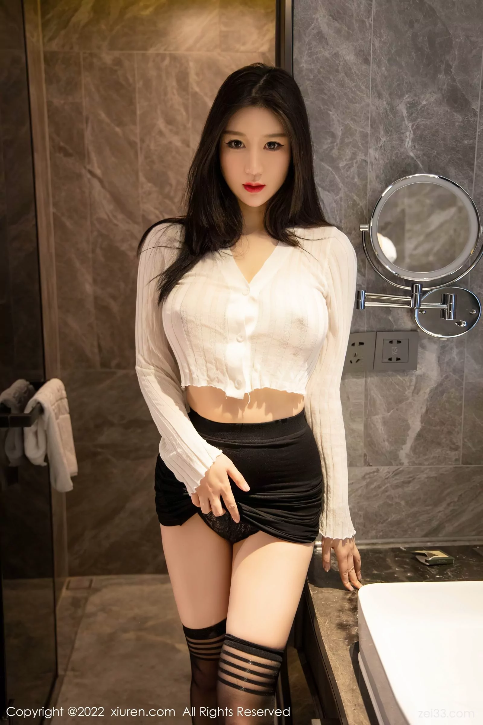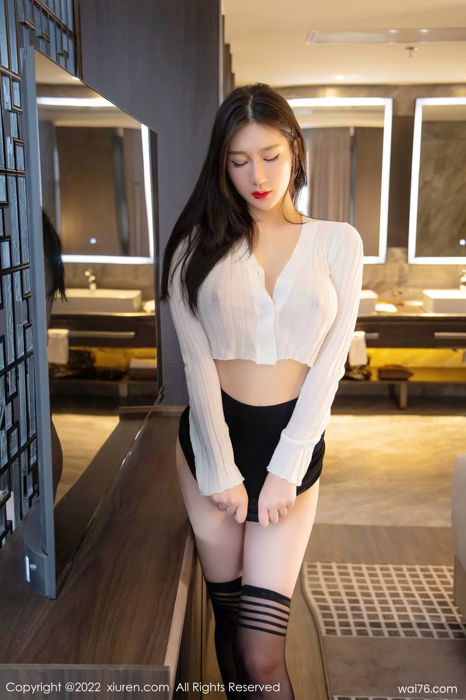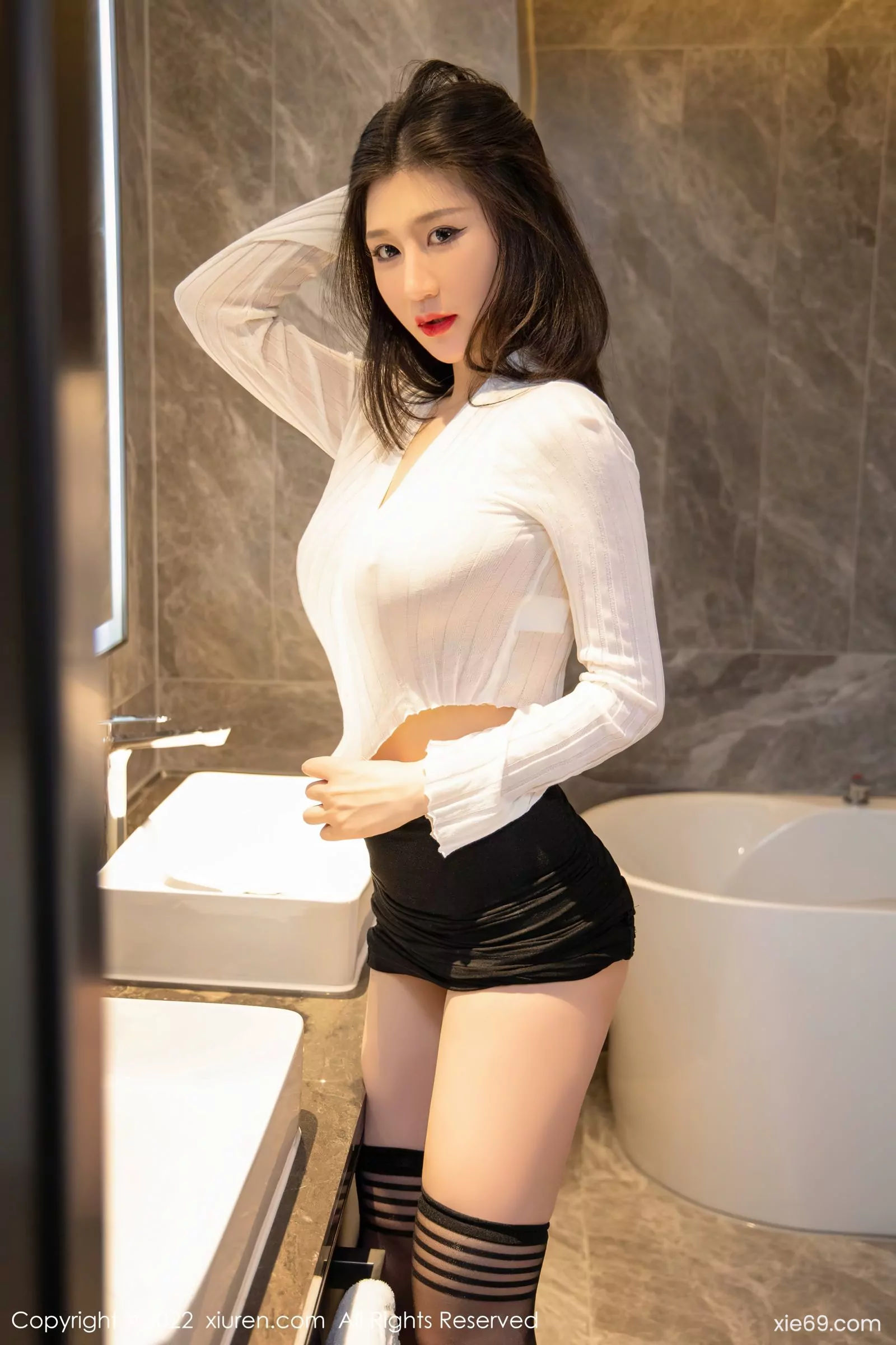 [XiuRen秀人網] No.4737 顧喬楠Cora 白色薄紗上衣搭配黑色短裙黑絲